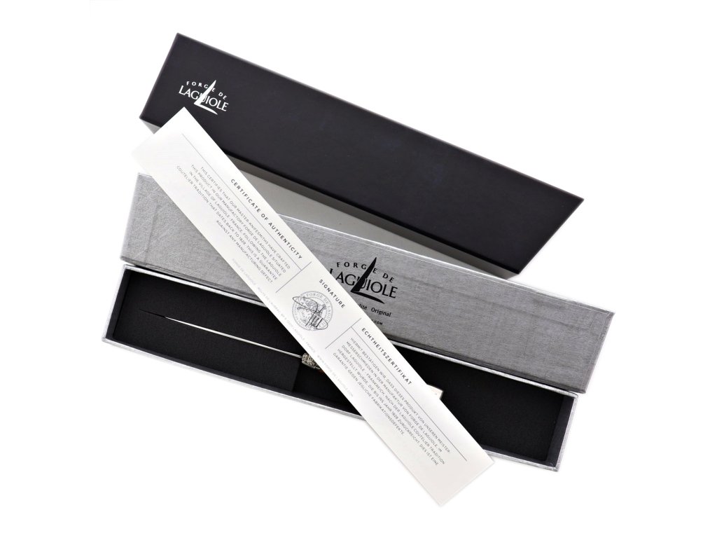 Čepele jsou kované za tepla z francouzské oceli (T12), vyrobené speciálně pro Forge de Laguiole, která poskytuje výjimečné ostří a zaručuje vysokou odolnost. Rukojeti jsou vyrobeny ručně z mnoha vzácných materiálů vždy jedním nožířem.