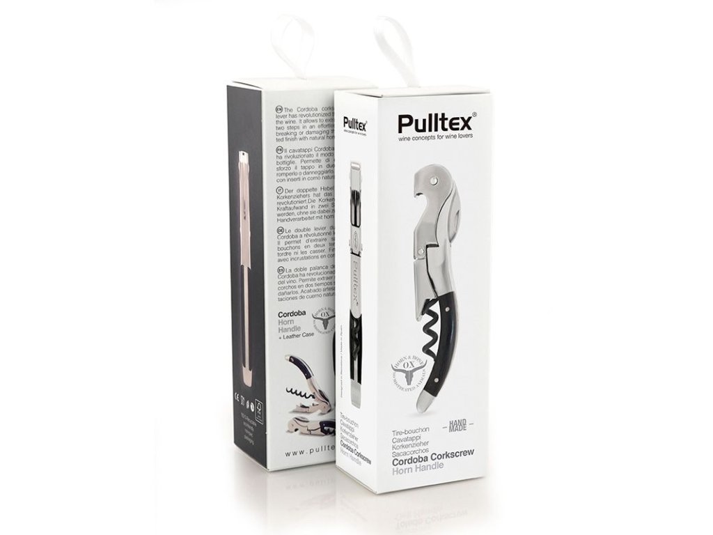 Vývrtka na víno, otvírák na víno Pulltex Pulltap's Cordoba Horn Handle wine opener. Tato praktická dvoufázová vývrtka na víno, díky svému ručnímu provedení, patří do kategorie luxusních produktů značky Pulltex. Její ergonomie byla navržena tak, aby výborně padla do ruky a práce s ní byla potěšením. Otvírák na víno Cordoba je opatřen teflonovou spirálou, která umožní snadný průnik spirály do korku, a také nožíkem umístěným na hřbetu vývrtky, pro ořez thermo kapsle. Pomocí této vývrtky na víno a její dvoustupňové kloubové podpory vytáhnete elegantně a rychle jakýkoliv korek z láhve.